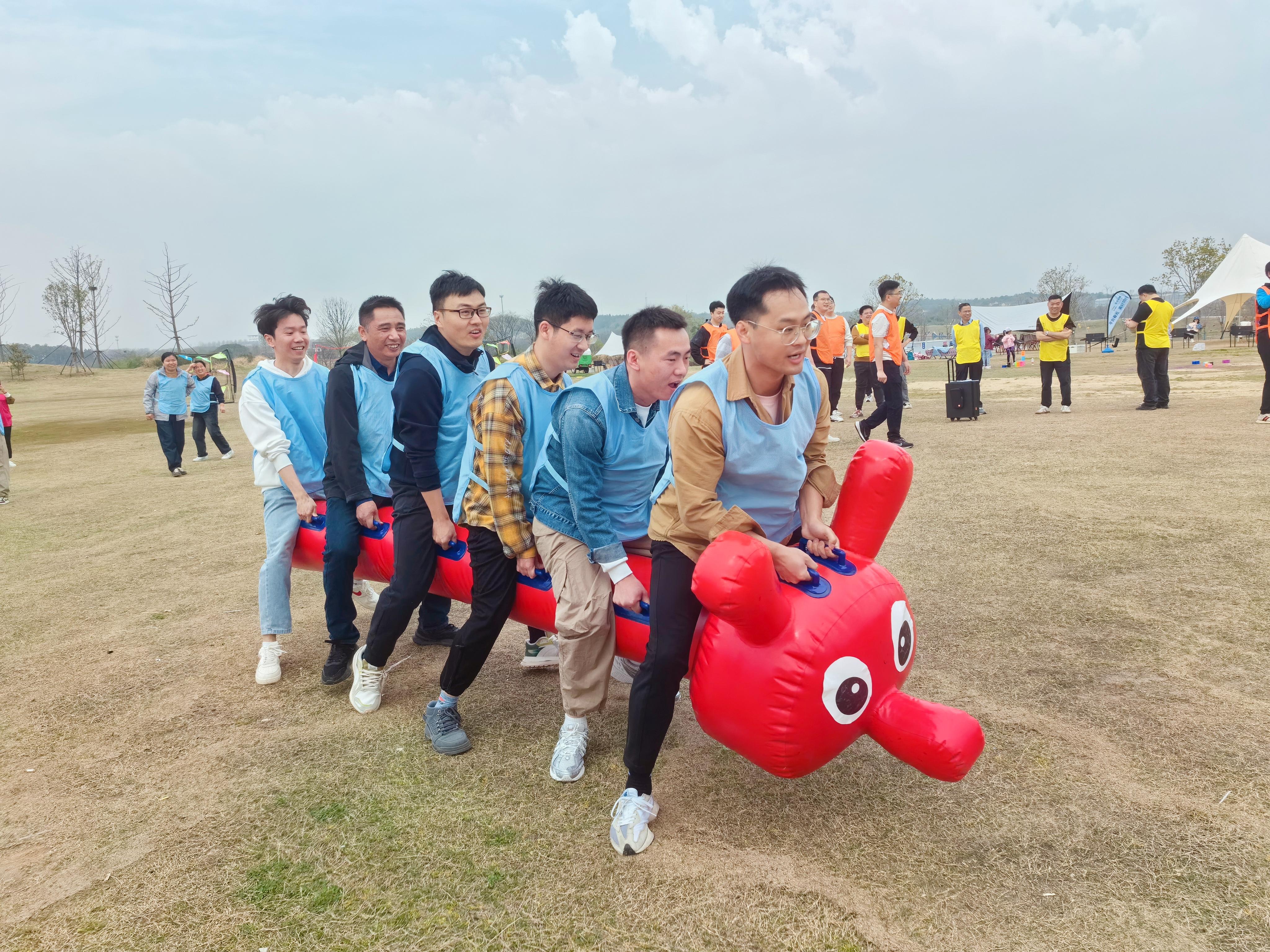 在愜意閑適的湖邊徒步熱身后,大家在寬闊平整的綠茵草地上正式開啟此次戶外團建。活動開始,大家分成紅、黃、橙、藍四色小組,各組隊員在組長的指揮和布陣下,通力合作,角逐壘方塊、連連看、拋飛盤等團隊競賽的魁首。在這些充滿創意與趣味的活動中,合作與競爭巧妙融合,同事之間的距離被悄然拉近;當隊員不慎跌倒落后時,大家相互鼓勵,起身再戰;當團隊頻頻得分領先時,大家擊掌擁抱,歡呼雀躍,現場喝彩之聲此起彼伏,各隊成員密切配合,展現出高效一致的執行力和協助配合的團隊精神。