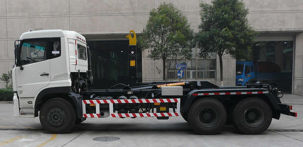 CGJ5250ZXXE5型車廂可卸式垃圾車是收集居民小區、街道等處的城市生活垃圾并將其送往垃圾中轉站或將垃圾中轉站箱體運至垃圾處理場的專用車輛。