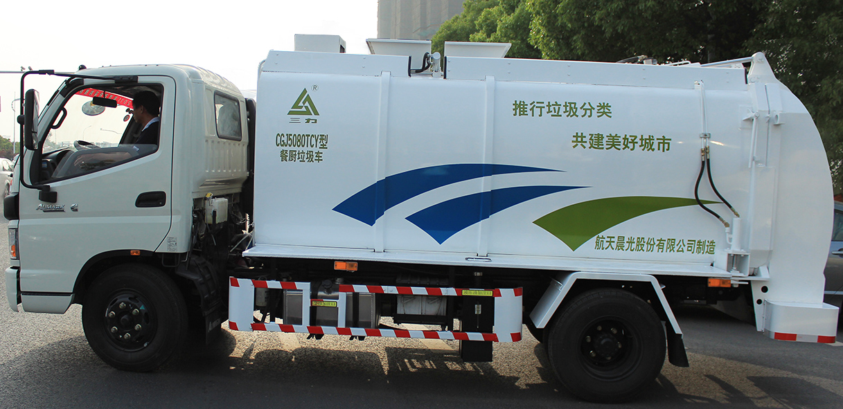 CGJ5080TCAE5/CGJ5080TCY型餐廚垃圾車是對賓館、餐廳、食堂的廚余垃圾、食品加工的廢料、副食品集貿市場和超市的過期商品等直接收運的專用車輛。該產(chǎn)品通過底盤取力器驅動液壓泵,產(chǎn)生高壓油,帶動液壓系統(tǒng)工作,從而提桶機構和頂蓋工作,將垃圾桶內垃圾倒入箱體;到指定地點,打開后門,推出推板進行卸料,完成作業(yè)。